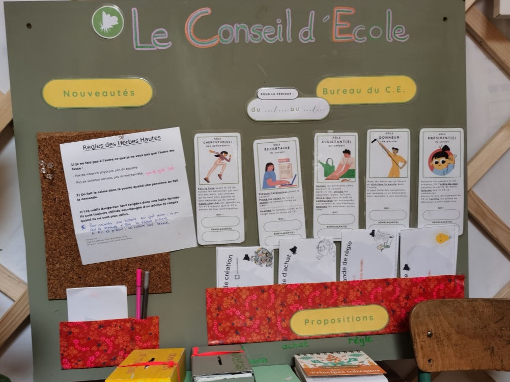 Un conseil est organisé toutes les 2 semaines environ pour coordonner et harmoniser la vie du groupe, prendre des décisions ensemble, s’accorder sur les règles, réfléchir aux ajustements nécessaires. Les décisions y sont prisent par consentement.